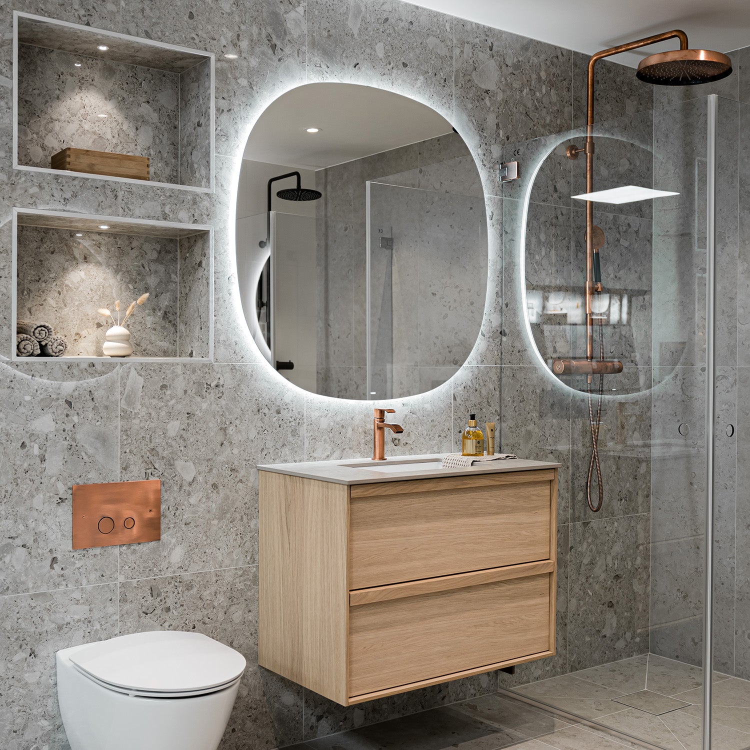 Tidlös kommod i ask från svenska Haven. Storlek 100 cm, underlimmat tvättställ och bänkskiva i samma sten som vägg/golv.
